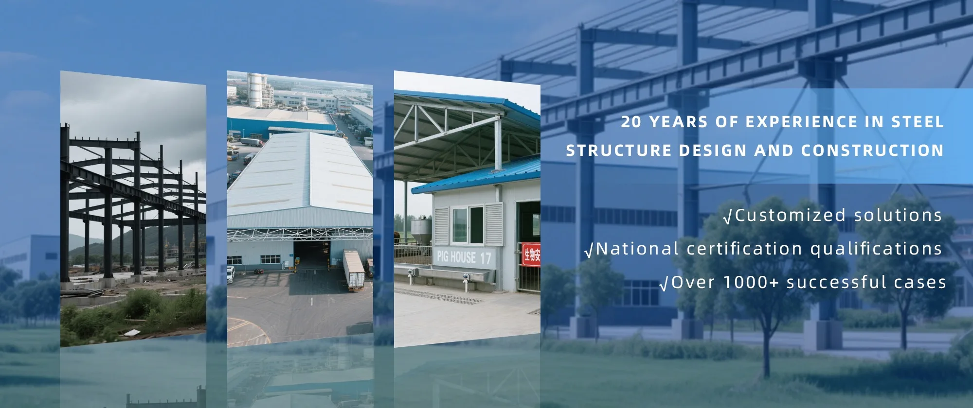 Besides large scale steel trading, we expanded business scope and specialized in steel structures, container houses, building materials and etc. About our steel structure factory, we have 2 modern factories and 3 production lines with a total area of 150000 square meters to produce. And we can provide you with picture、video information of all production links, from raw materials to steel processing, the whole process of visual production. You can even video call us to watch workshop production.